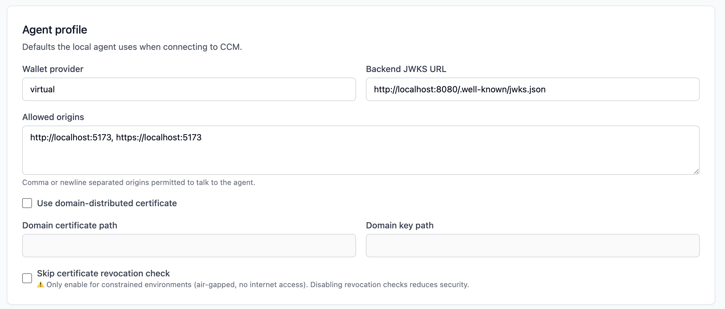 Control how the backend communicates with the local Crayonic Agent. - Allowed Origins: Whitelist of domains allowed to talk to the agent. - Certificate Settings: Configuration for the local TLS server (optional).