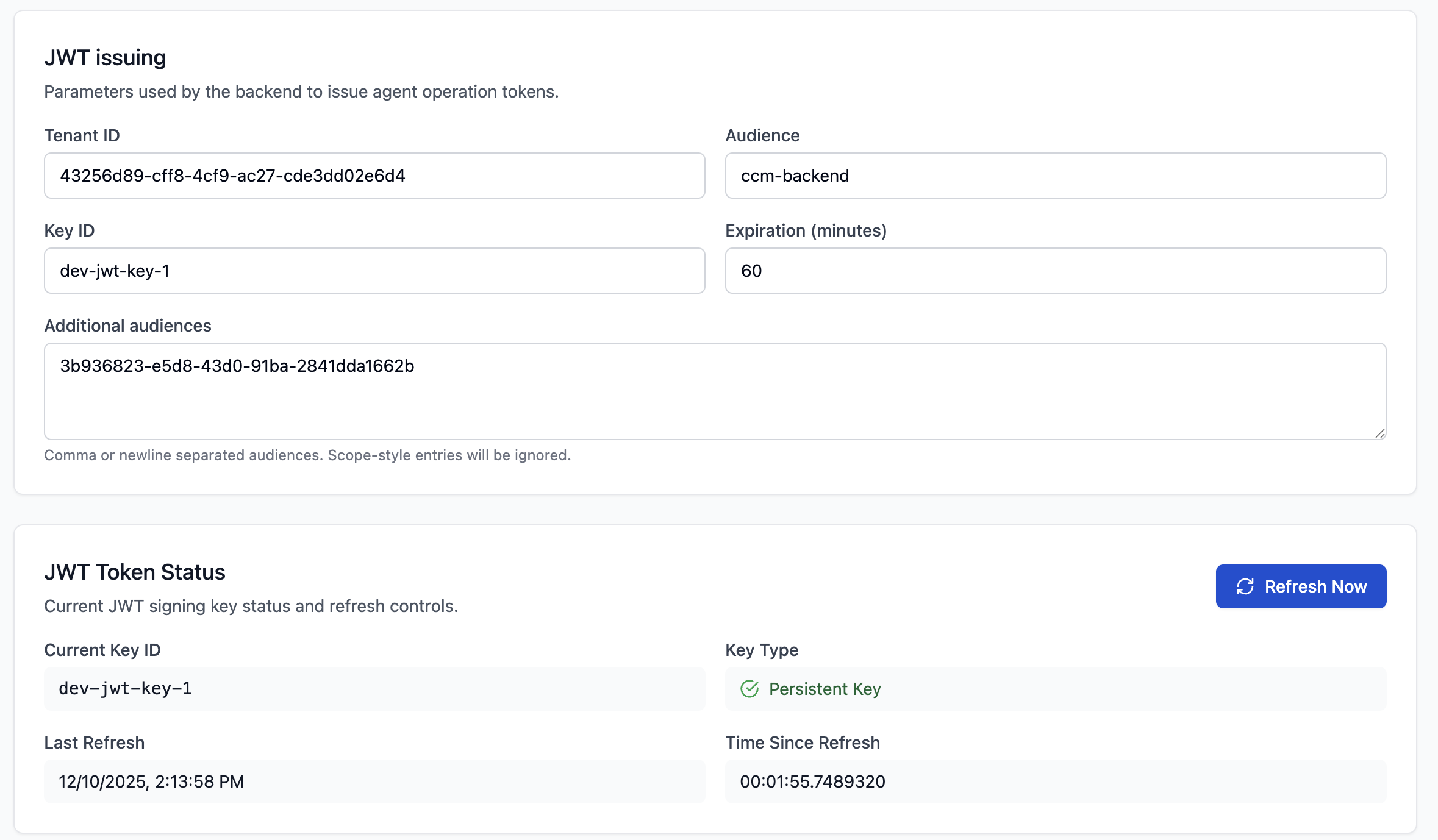 Configure the security tokens issued by the CCM backend. - Token Expiration: How long admin sessions last. - Key Rotation: View current signing keys and force a key rotation if necessary. - Ephemeral Keys: Indicated by a yellow warning. Means keys are generated on startup and lost on restart (Dev mode). - Persistent Keys: Indicated by a green check. Keys are loaded from disk.