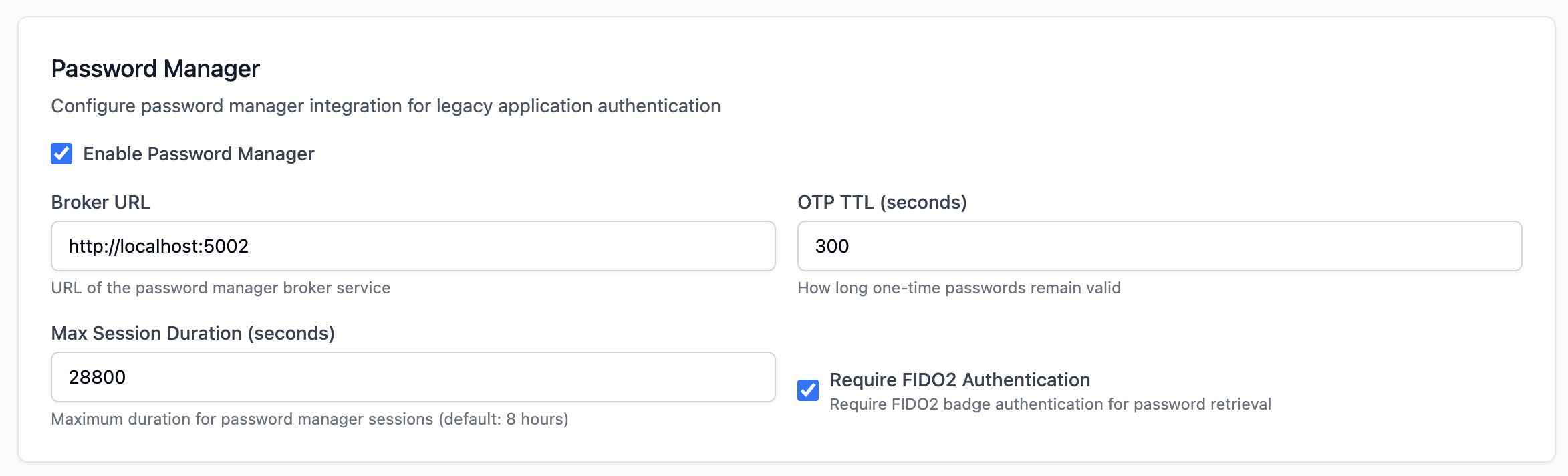Configure integration with the Legacy Password Manager module. - Broker URL: Address of the PWM Broker service. - Session Duration: Time-to-live for legacy app sessions. - Require FIDO2: Enforce hardware auth for password injection.