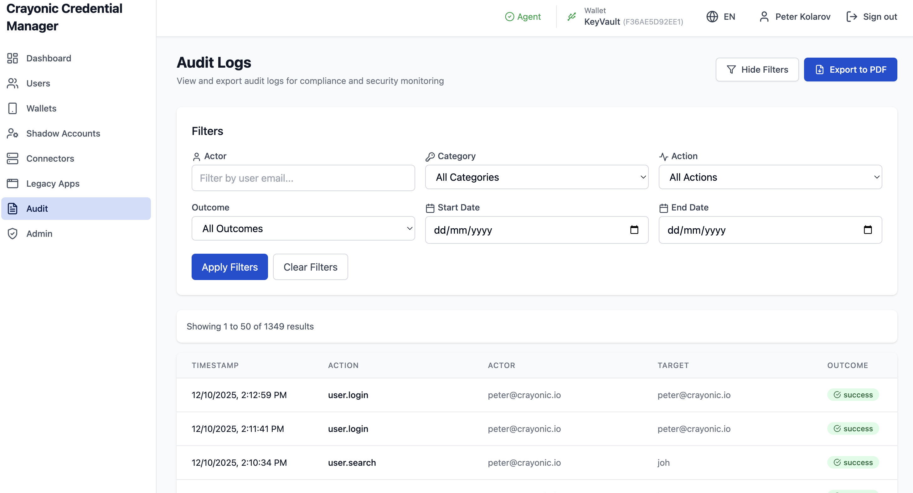 Click Export PDF to generate a downloadable report of the current filtered view, suitable for compliance archiving.