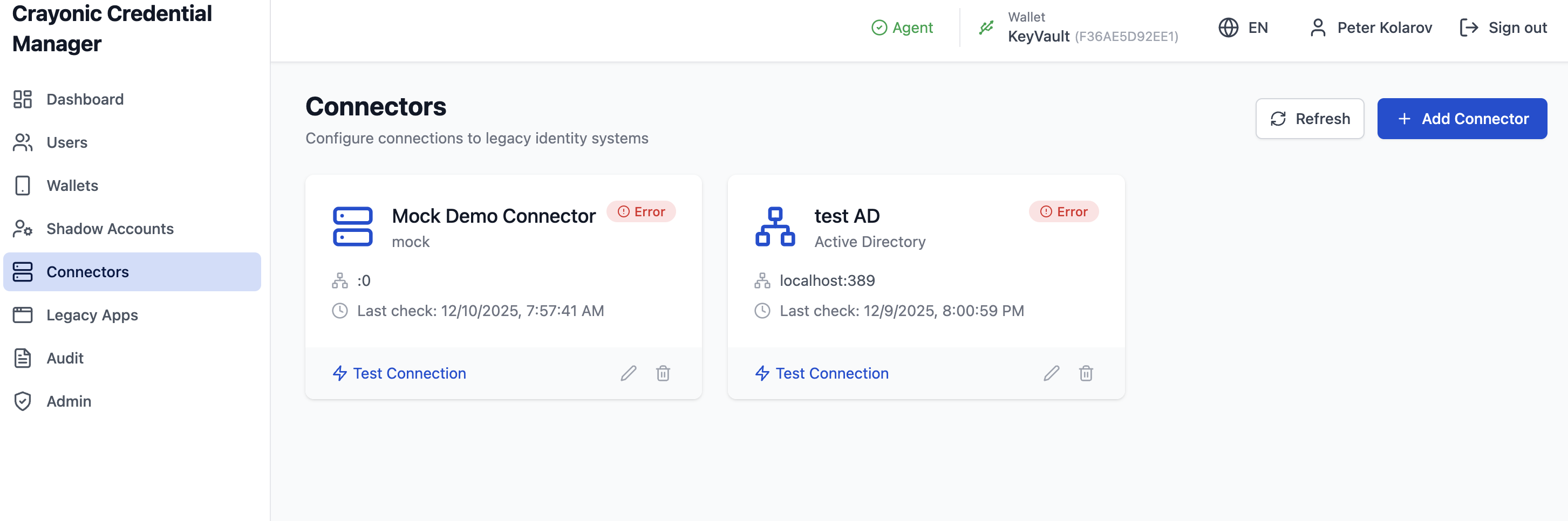 - Connected Device: Status of the locally connected Crayonic KeyVault or administrative hardware token.