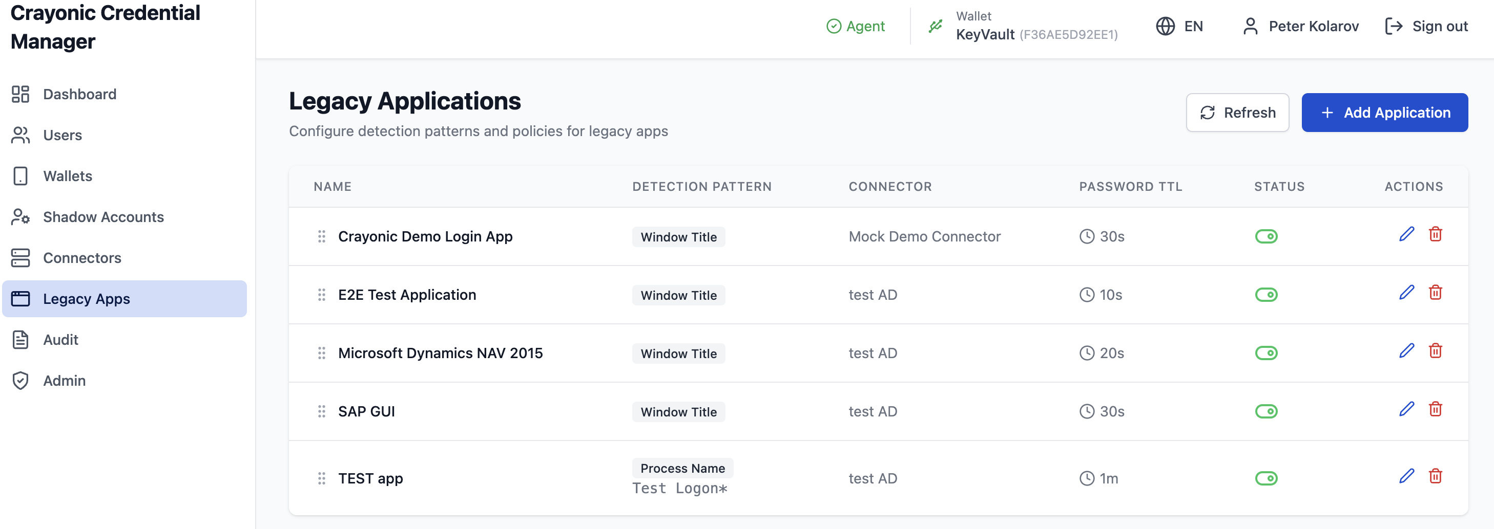 Configuration: - Connector: Which backend connector validates credentials for this app. - TTL (Time-To-Live): How long a password injected into this app remains valid before requiring re-authentication.