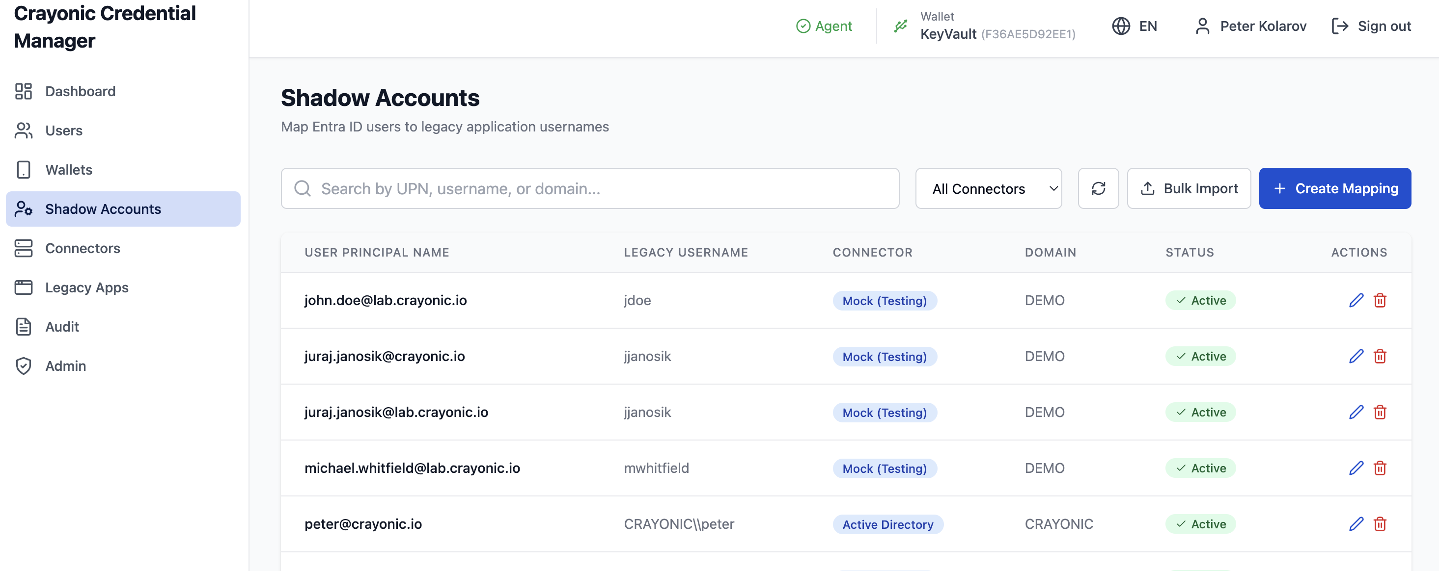Bulk Import: You can upload a CSV file to create multiple shadow account mappings at once.