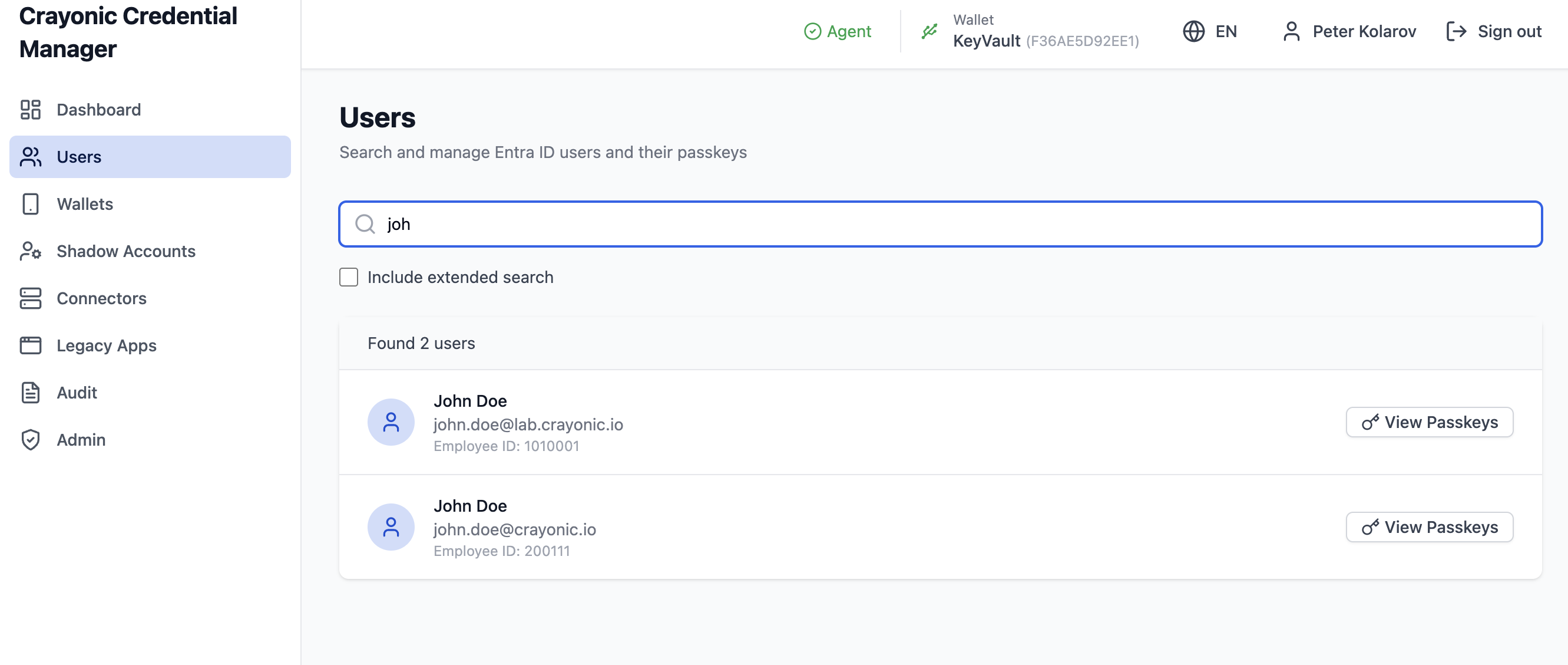 You can search for users by name or User Principal Name (UPN). - Extended Search: Check "Include Extended Search" to perform a deeper search that matches against passkey metadata (e.g., finding a user by the serial number of their registered key). Note: This may be slower.