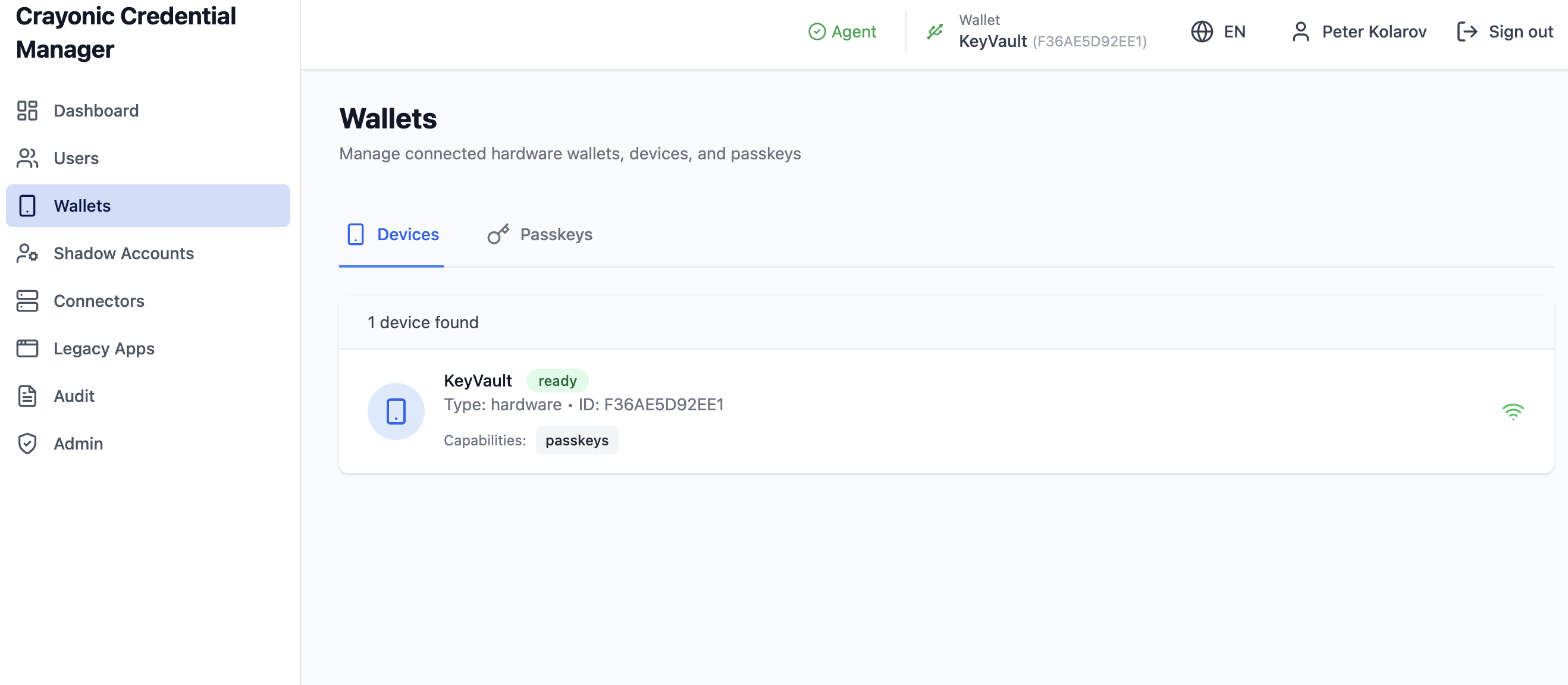 Lists all hardware devices currently visible to the Crayonic Agent. - Status: Connected, Ready, Offline. - Capabilities: Supported features (e.g., FIDO2, PIV).