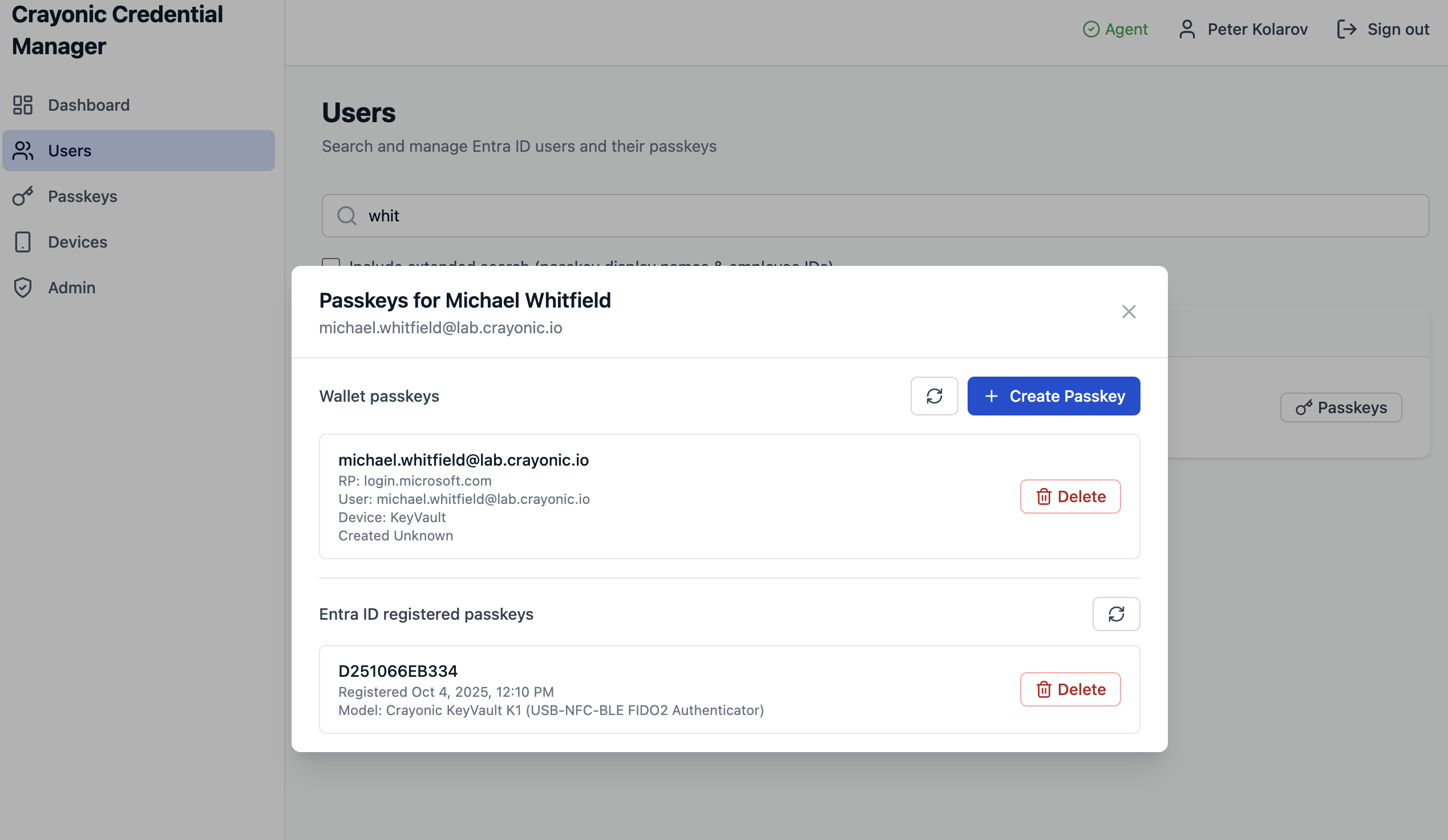 - Passkey management: View, search, create, and remove passkeys from MS Entra ID or Crayonic Wallets